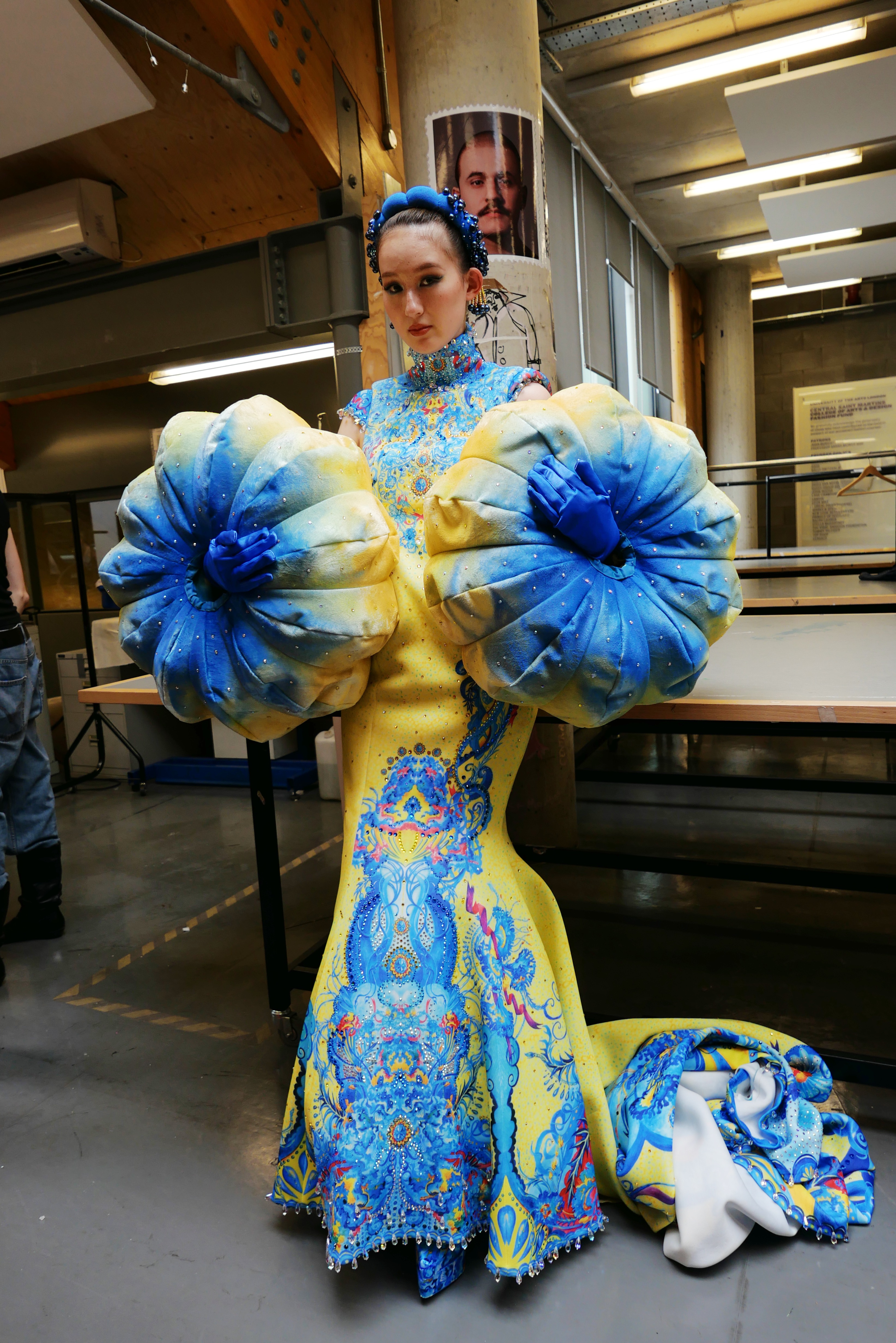 collars as seen in the Cephalus Suit and the blooming flowerbud sleeves paired with the Anthocyane Evening Dress are cut boldly for