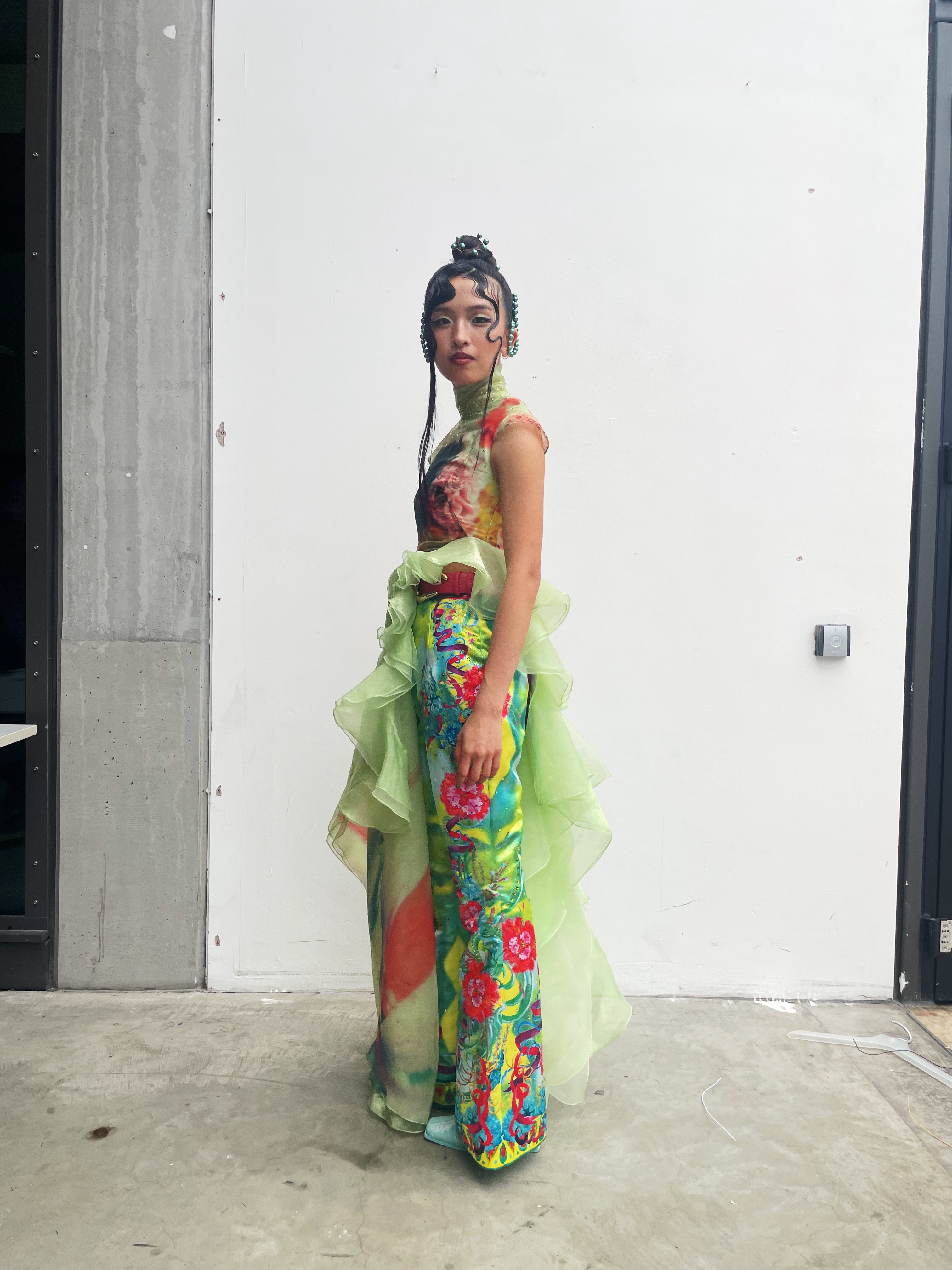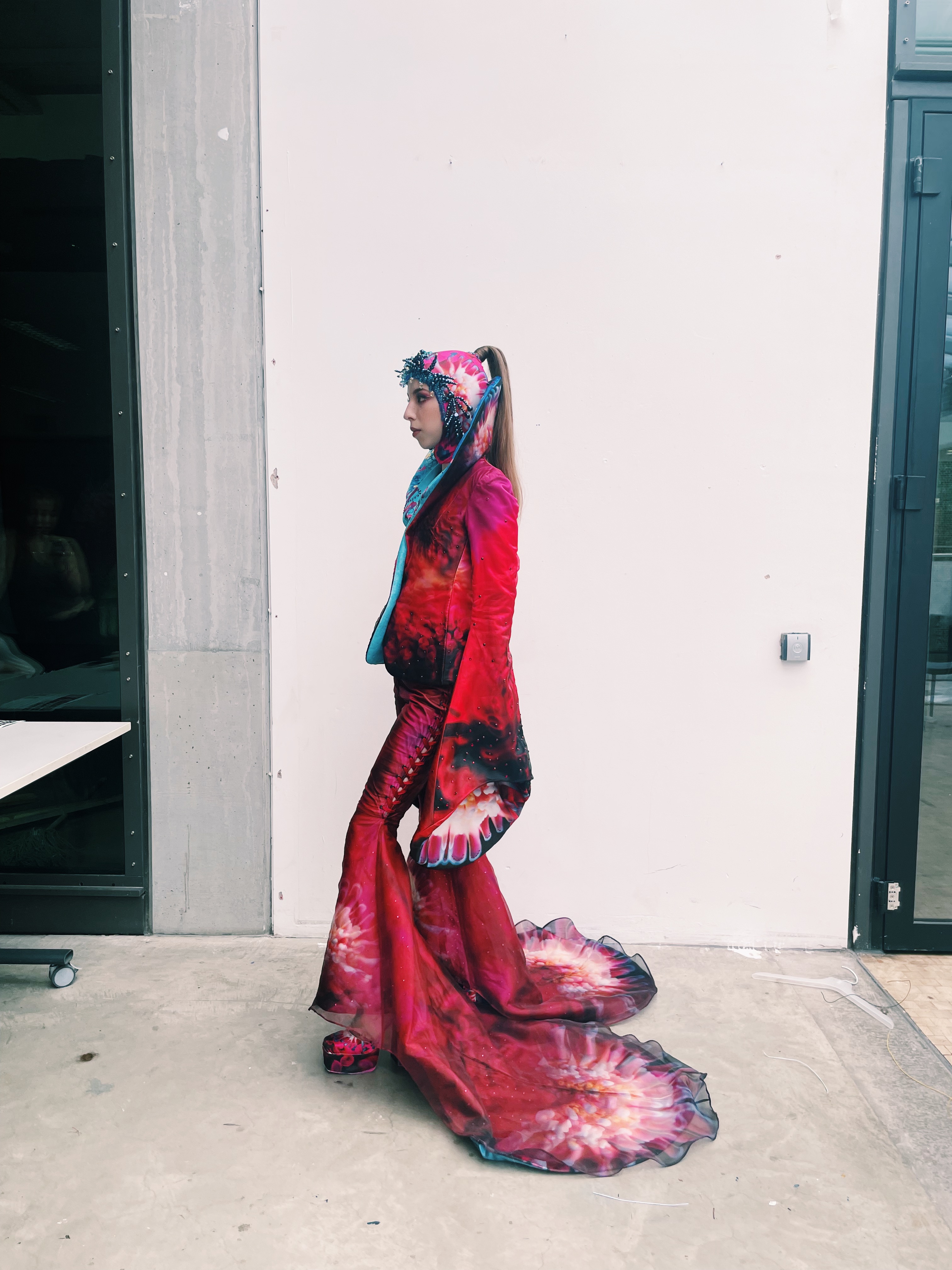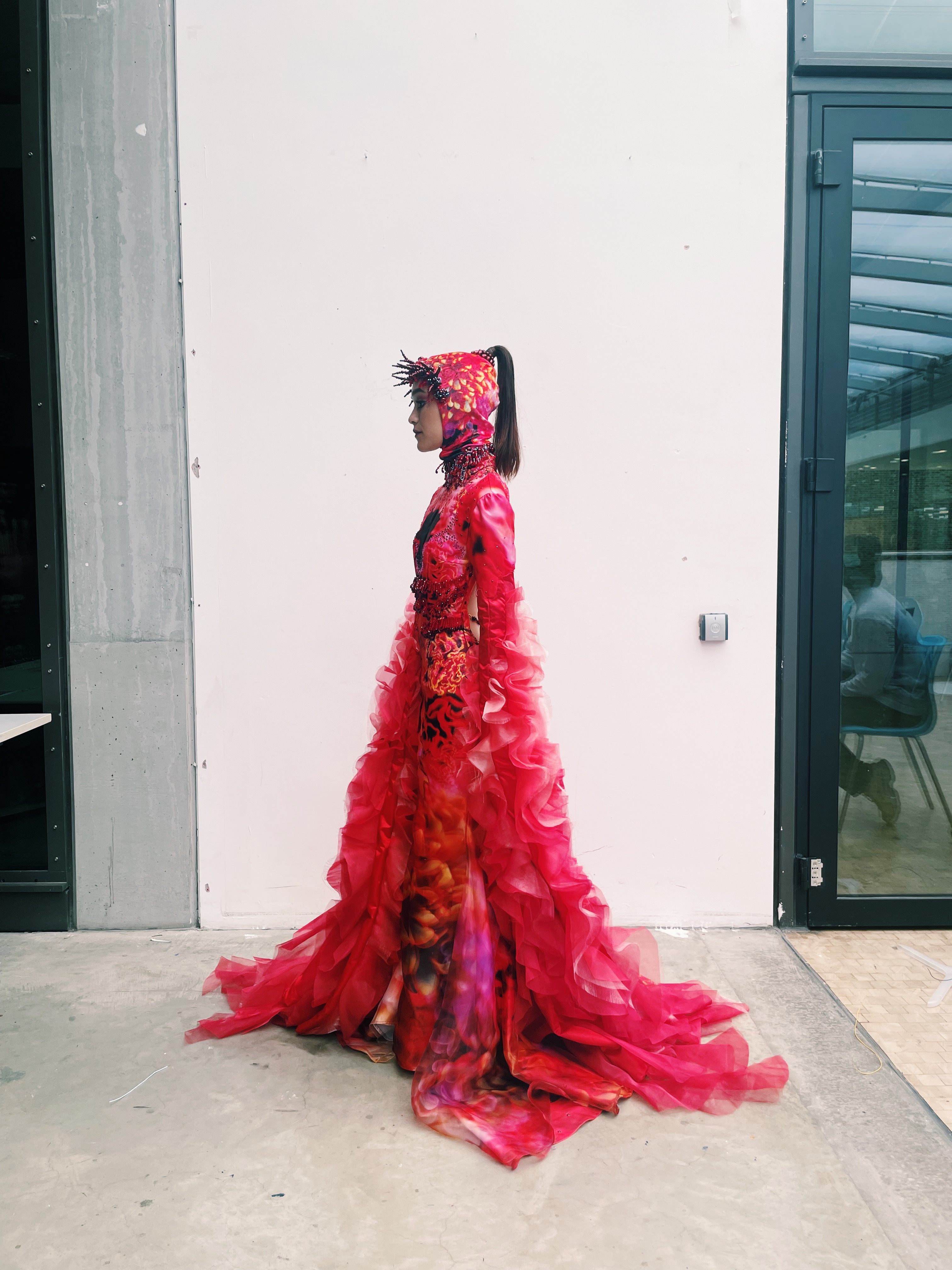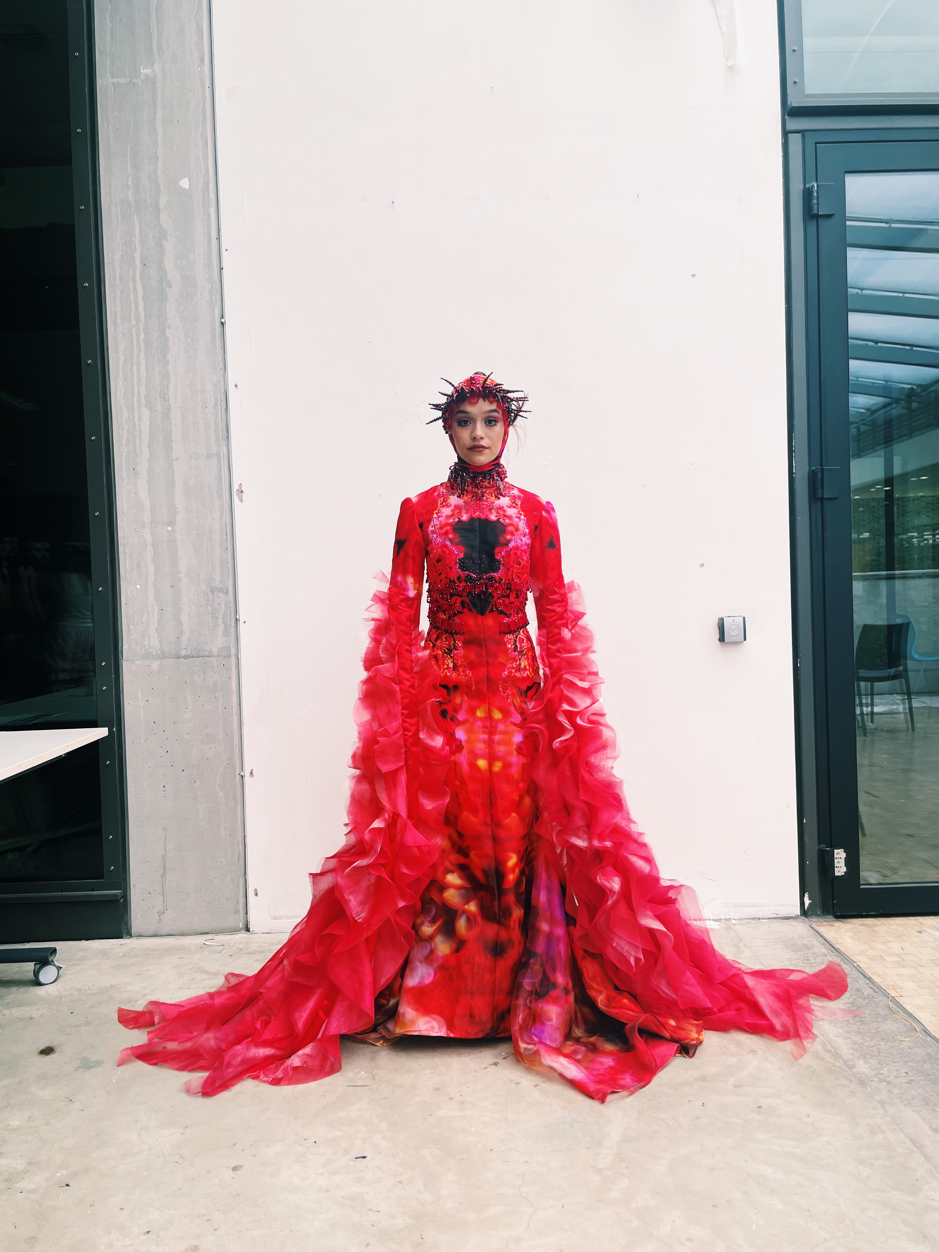 I suffered from a series of fainting spells in 2023 before my final year of my BA Degree at Central Saint Martins , which prompted me to contemplate my life and career as a designer and artist in today's modern world. Seeing my MRI brain scans up close made me realize how much I often take for granted, and how wondrous our bodies can be - as much as we try to control and decipher it, there's still a lot we don't know about ourselves.  Like falling in love with my ‘ugly baby’; other people may not appreciate the complexity of my brain, but in that moment I did.  I thought that this quote from Shakespeare's Othello, "Our Bodies are Gardens, to Which Our Wills are Gardeners", was particularly apt - speaking not only to the idea of self-discipline and control, but also to the unexpected turns of life and most of all, becoming catalyst for the idea of interpreting what plants might be metaphorically grown in my own 'Garden of Eden'. I took the shapes of my internal organs as a reference to make something beautiful out of their disturbing shapes, so that other people could appreciate their beauty through trompe l'oeil (trick of the eye) 'floral' prints. I also experimented with imaging fruit and vegetable cells under a microscope and using them as almost new-age polka dots, and feeding my photos directly into generative AI (Midjourney) for one particular look so that I could control its output in a more ethical way. Existing flowers are thus forced into into a elegant yet somewhat bizarre and uncanny representation of the natural world, in a comment on life’s