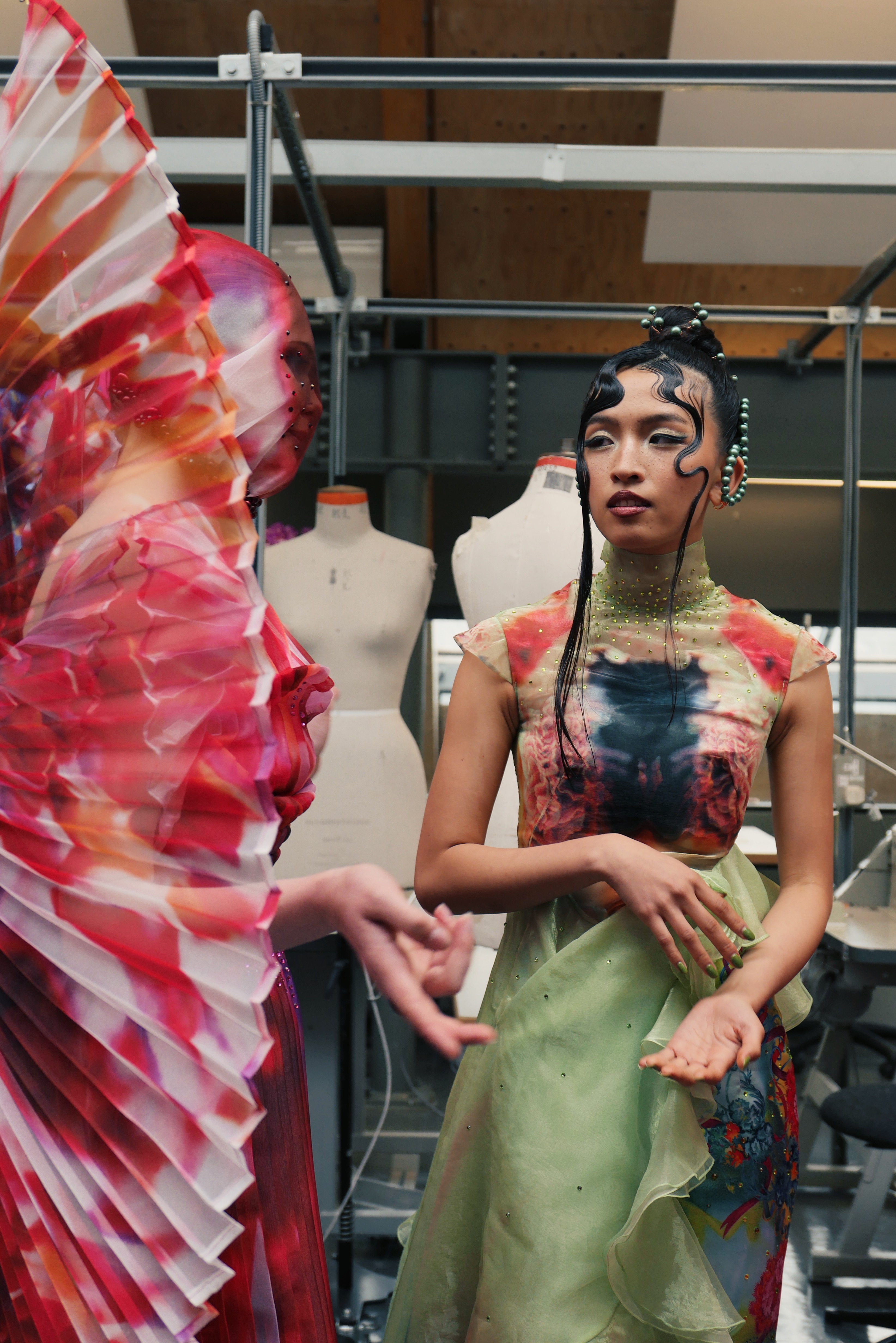 All the materials I used in the collection are deadstock and upcycled through print-engineering to also minimize fabric waste, sourced locally from warehouses in Hackney, with generous sponsorship of hand-embroidered crystals from Crystals by Preciosa.