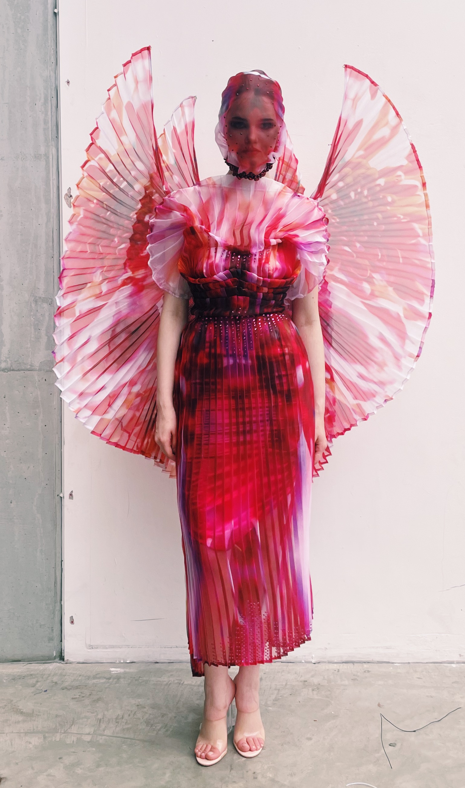 transience and the intersection of technology and traditional craft. I imagined the woman wearing the garments to feel powerful, elegant, unafraid of bold colour, but most of all empowered to shine, with several elements from the collection being ready-to-wear while having several luxurious options for a special event.