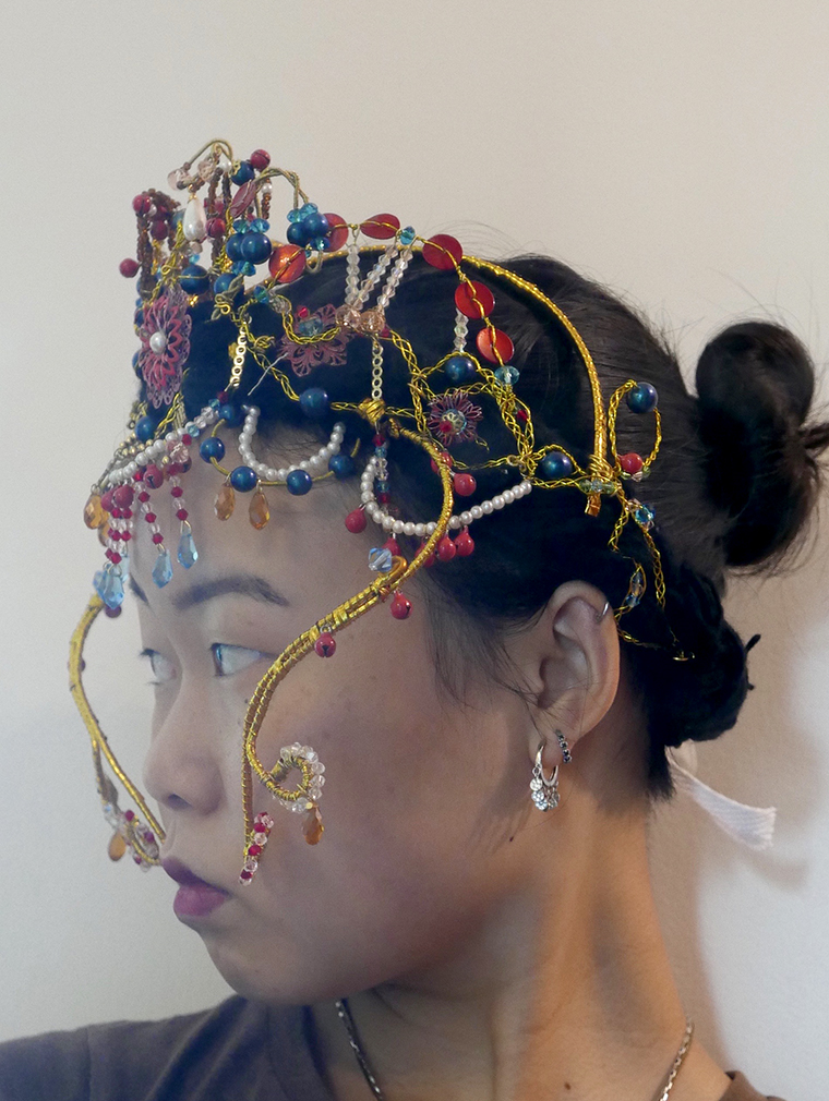 An online collaboration between Malaysian-British soprano Eyra Norman and myself, drawing upon her personal artwork based on her synaesthesia (where sounds and music may neurally translate into colours or visual reactions) and the coming of summertime. The headpiece was inspired by Eyra’s Indian and Malaysian heritage as well as her childhood growing up in Hong Kong, pulling inspiration from Cantonese Operatic hairpieces, ancient Qing-dynasty Chinese kingfisher feather jewelry, and female performers of the past including the oft-bejewelled Elizabeth Taylor and dancer-turned-spy Mata Hari (research images below right).
